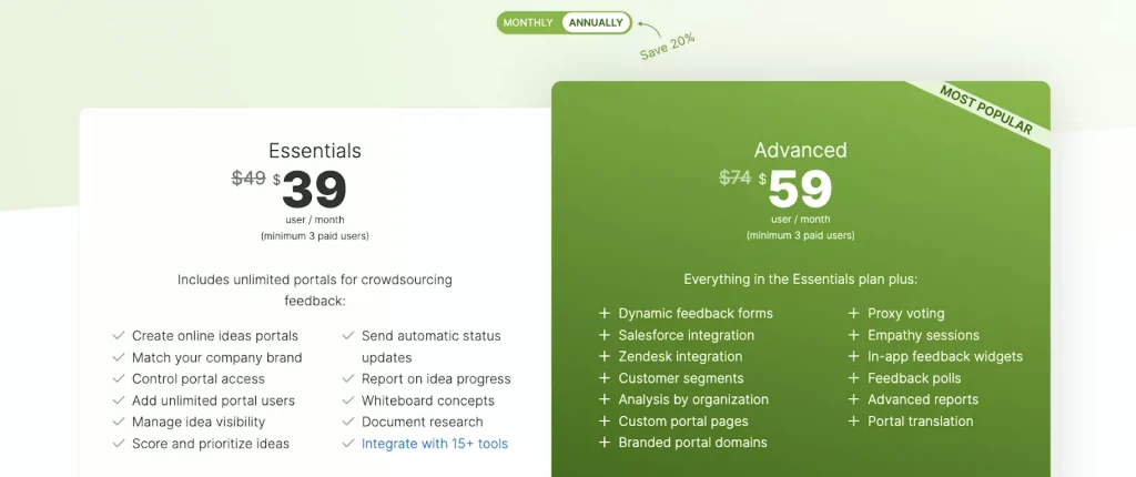- Startup: This plan is designed for small teams and costs $59 per user per month when billed annually. It includes features such as strategy creation and management, road mapping, idea management, and basic reporting.
