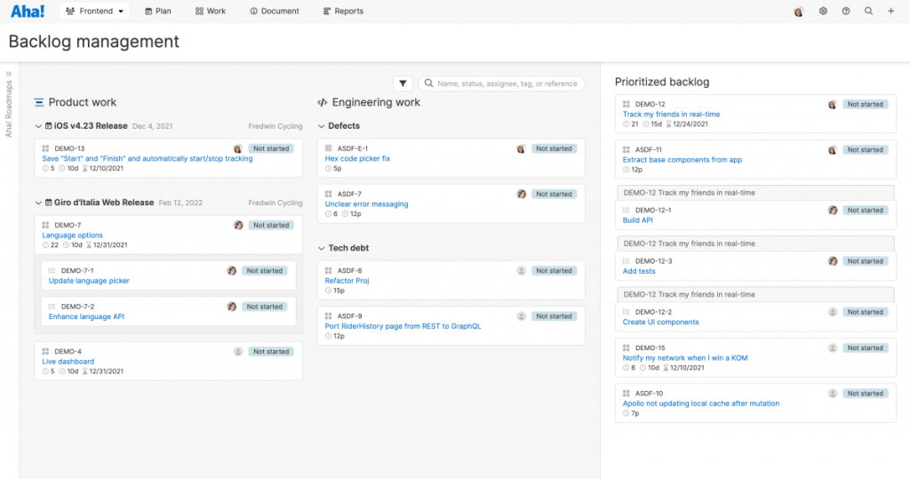Aha! Software’s product backlog management feature is a valuable tool for businesses looking to prioritize and manage their product development backlog. The feature enables product managers to create, prioritize, and manage their product backlog in one central location.