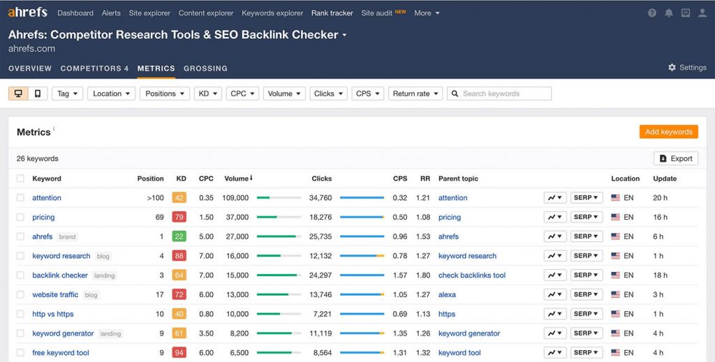 In addition to these metrics, Ahref’s “Keywords Explorer” also provides other data and analysis tools, such as the ability to see the top page ranking for a particular keyword and compare the performance of different keywords. This can help you identify valuable keywords and optimize your website’s content and PPC campaigns for better results.