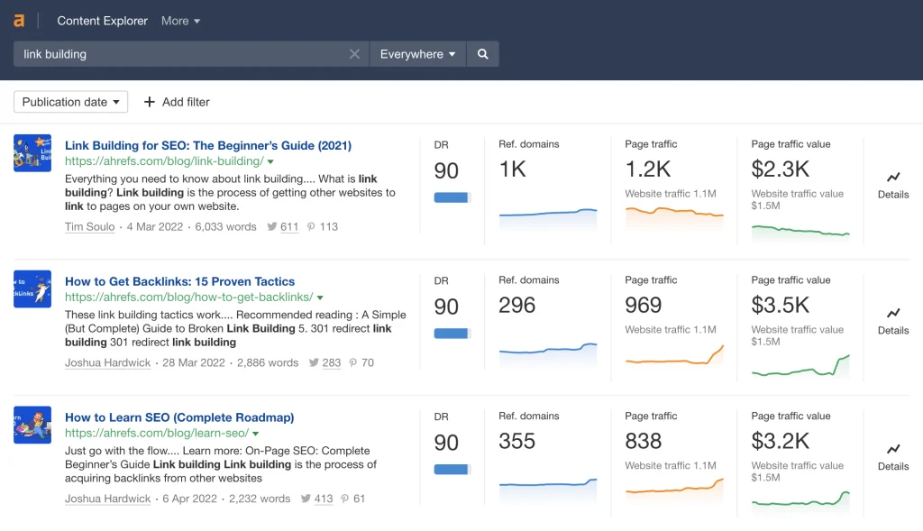 The Ahrefs find content examples and ideas from a database of 11 billion web pages. It claims to discover 40 million pages daily, so you will not complain about the quality of the results. The tool can check any content page’s organic traffic, backlinks, keyword rankings, and social shares over time.