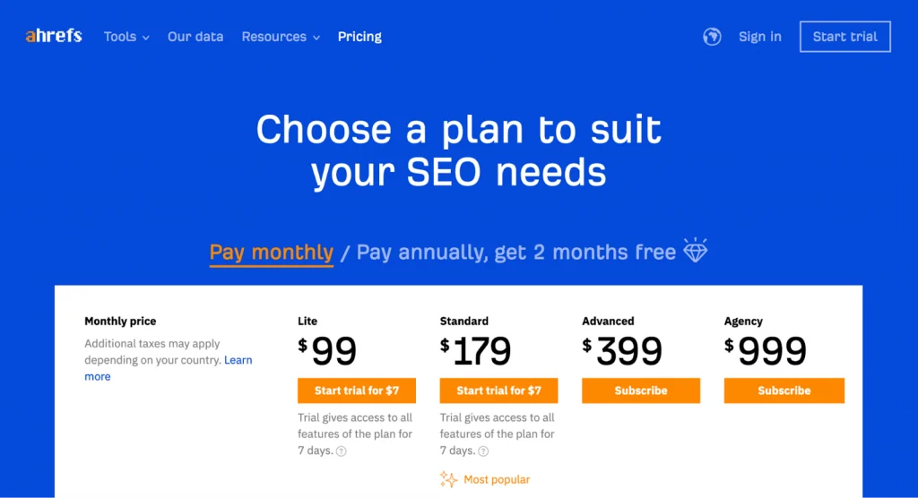 Furthermore, Ahrefs is more expensive than its competitors, such as Moz and Semrush. For example, Semrush’s business plan is available for $449.95/monthly, Moz Premium is available for $599/mo, and Ahrefs offers an enterprise plan at $999/monthly or $833/year.
