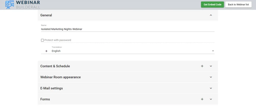 The final stage is to integrate the webinar into the website when it has been made and its parameters changed. Click the code icon to accomplish it. Then duplicate the specified code ID and secret.