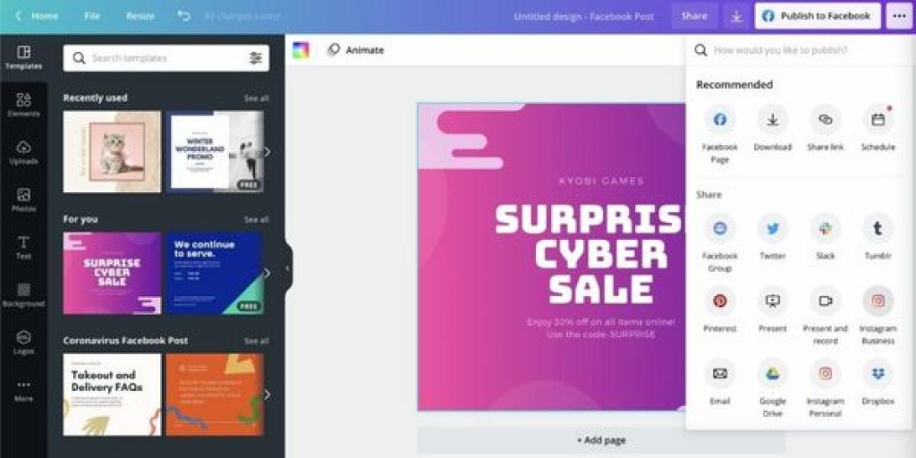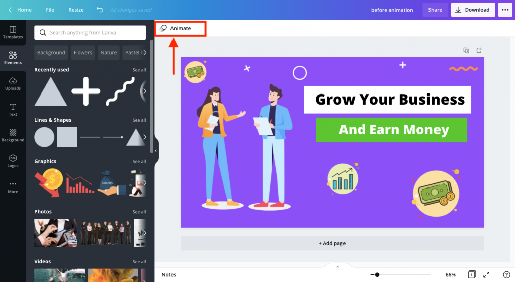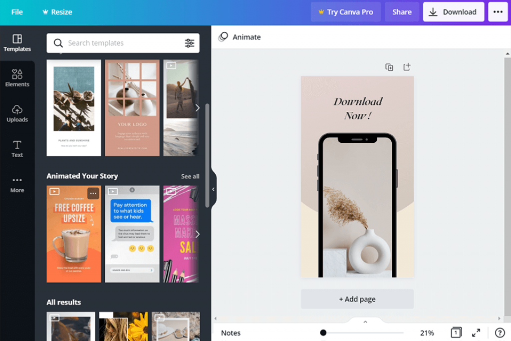 Want to add movement to your social media posts? Use Canva Pro’s animation creator to easily add instant animation to your posts, presentations, and anywhere else you need a stunning visual impression. Simply click once to animate, then download it as a GIF or video format. There are 14 types of animation, and the choices available are very good, and they do help make the created graphics look good and unique.