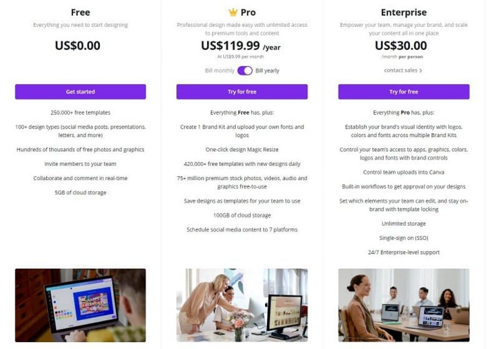 Below is a comparison of the features included in the free, pro, and enterprise plans of Canva.