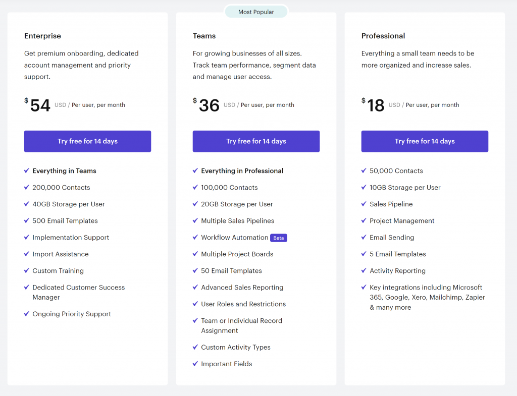 Overall, Capsule CRM’s pricing plans are designed to meet the needs of businesses of different sizes and with different levels of CRM needs. The Enterprise and Teams plans offer additional features and capabilities for businesses with more advanced needs, while the Professional plan is suitable for small businesses with basic CRM needs.