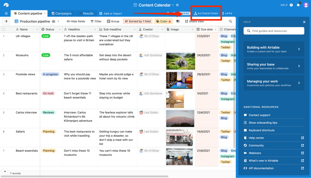 Help Center: Airtable has a comprehensive Help Center that contains articles, videos, and tutorials that cover a wide range of topics. Users can search for specific topics or browse through categories to find the information they need.
