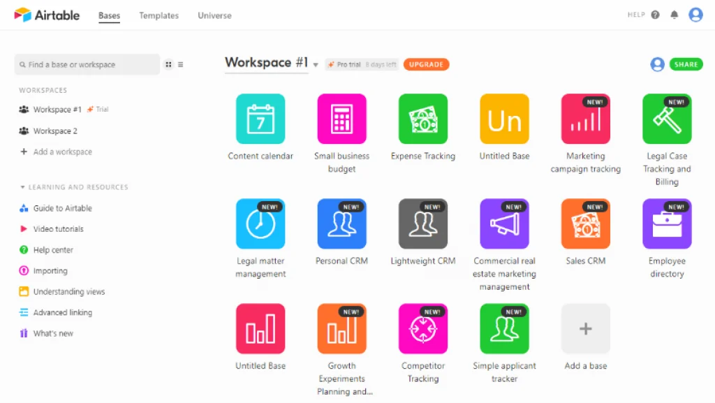 Once you’ve signed up, you’ll be prompted to create your first “base” – this is where you’ll store your data. You can choose from a variety of pre-made templates or start from scratch and create your custom layout.