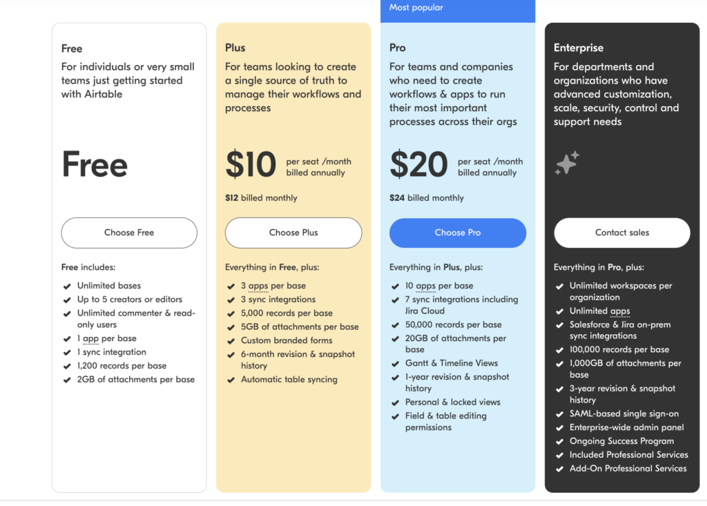 So what plan is right for you? Thankfully, Airtable offers four different pricing plans, each tailored to a different set of needs and budgets. Here’s a breakdown of what you can expect from each plan: