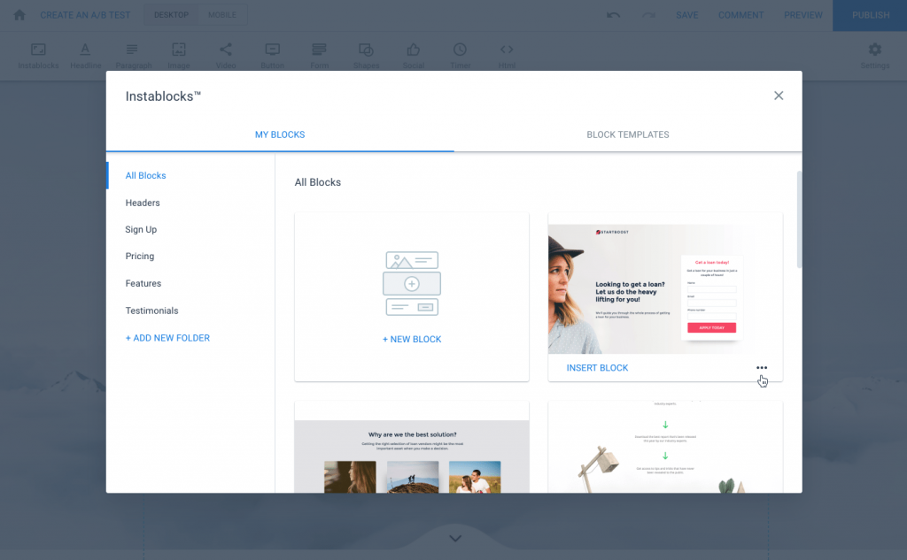 In Instapage Instablocks, you can develop custom blocks and save them for future reuse in your landing pages. For instance, you could build a custom testimonials block that includes positive feedback from your clients, and then save it as an Instablock. Then, whenever you’re developing a landing page that requires you to include testimonials, you can rapidly put that Instablock into the page.