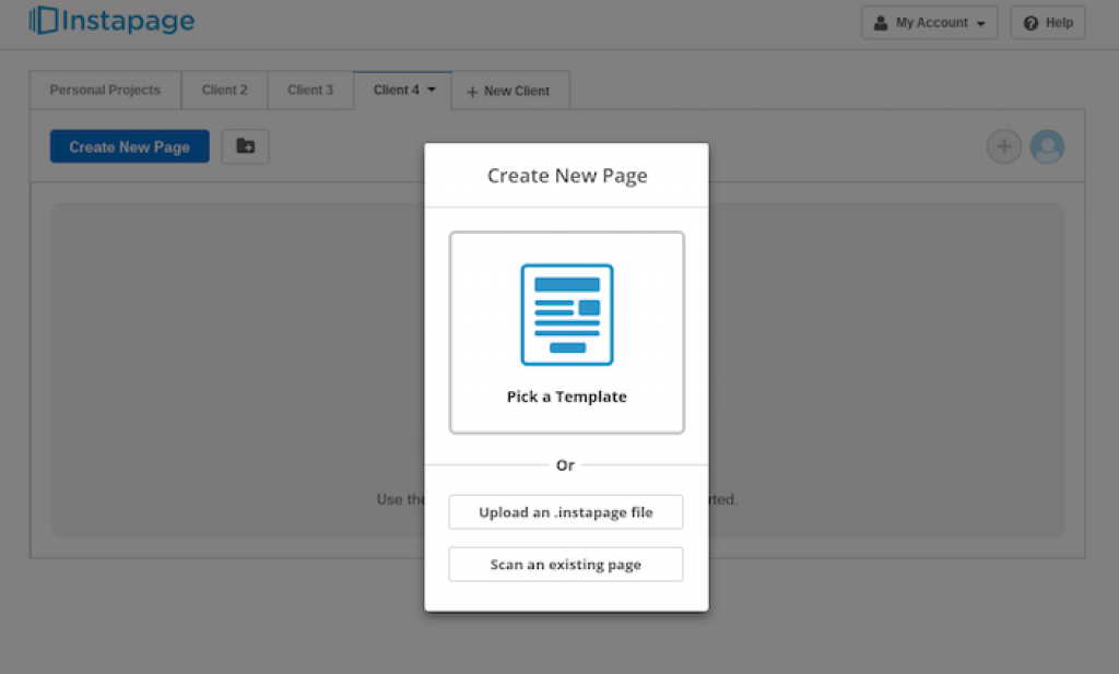 ● Then you will get three options to choose templates to build a page. Select from the template library, upload an Instapage file, or scan an already available page with Instapage’s Template Importer feature.