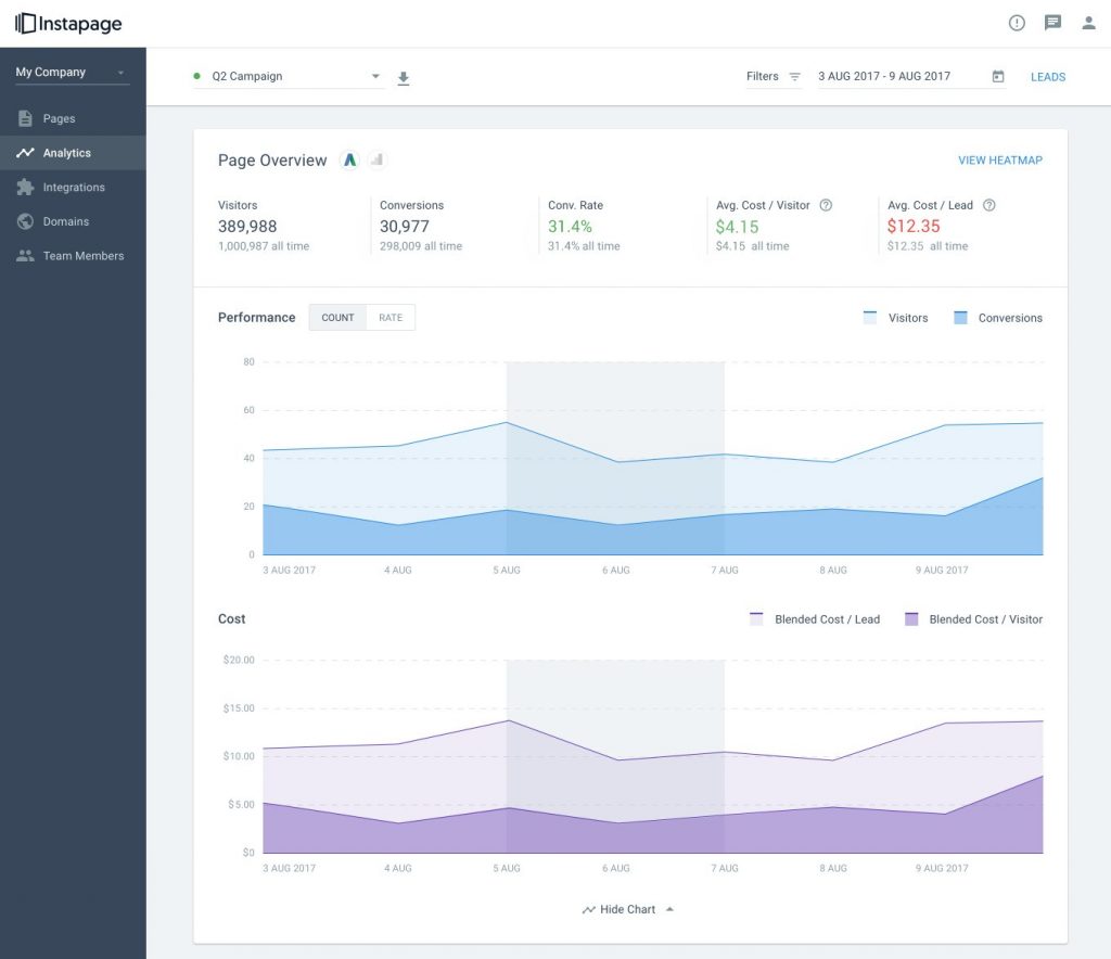 This option helps you to monitor the performance of your landing page. It helps to analyze the details about the function of your visitors in Instapage. This includes the areas where they click and scroll. A heat map can show if any potential issues occurred on the page. You can see conversion rates and other data analytics here. Google Analytics integration gives you more insights about the running of your landing page.