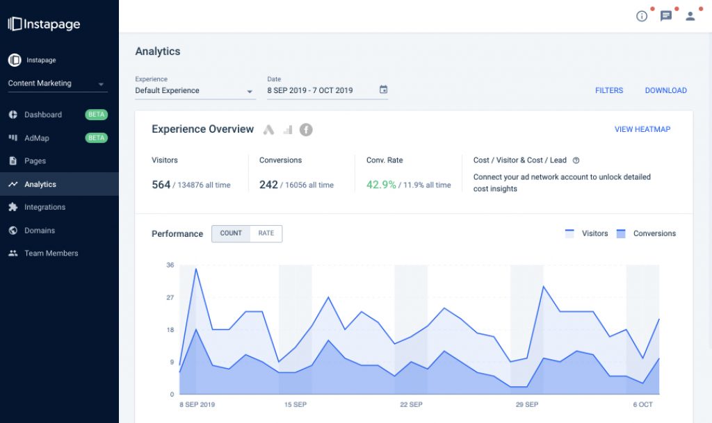 ● Instapage can integrate with Google AdWords to see advertisement data inside your Instapage dashboard.