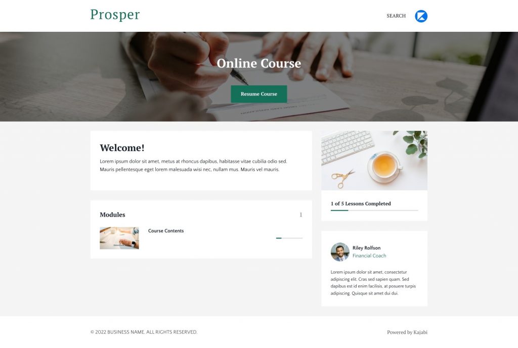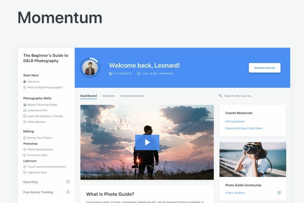 Kajabi has a Momentum Product theme that exhibits a video or picture at the forefront and is planned to be visually fascinating from the start. By using the Momentum theme your content uses the most area on the page, while yet making it simple to drive from lesson to lesson.
