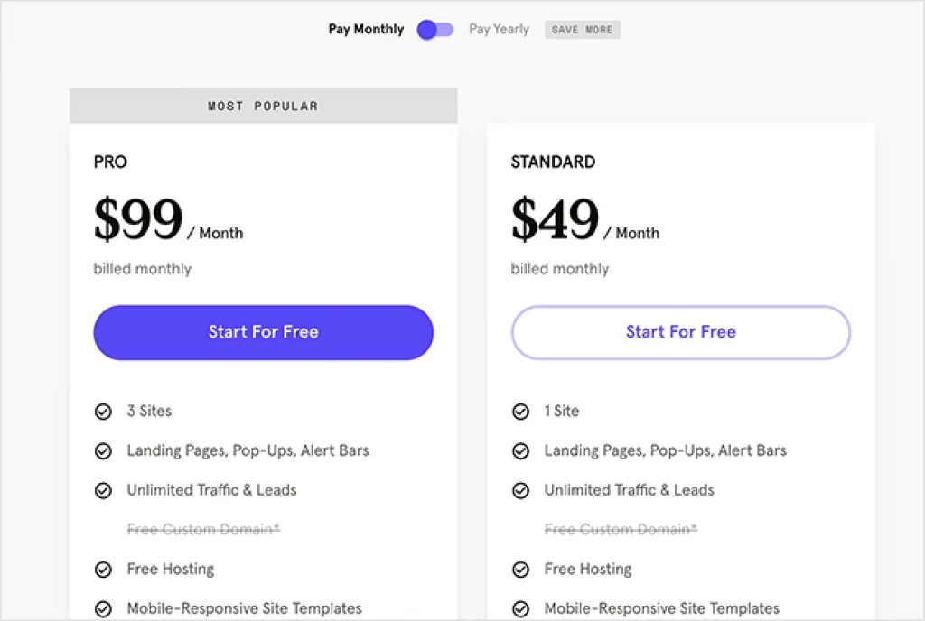 Starting at $19 per month if billed annually and $49 per month if billed monthly, this pricing plan is almost similar to Leadpages Pro, except with this one you can only make one website instead of three.