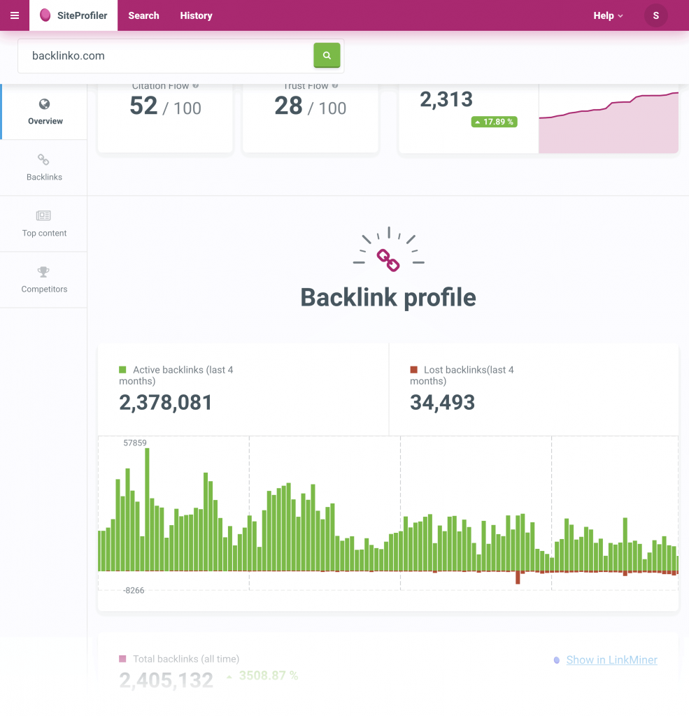 See, if you’re looking to get an edge on your competitors by stealing their best content ideas, SiteProfile is a valuable tool. It measures a site’s total backlinks, strength, and popularity on Facebook and also highlights the site’s top content. This lets you quickly see what’s working well for them so you can replicate it on your site.