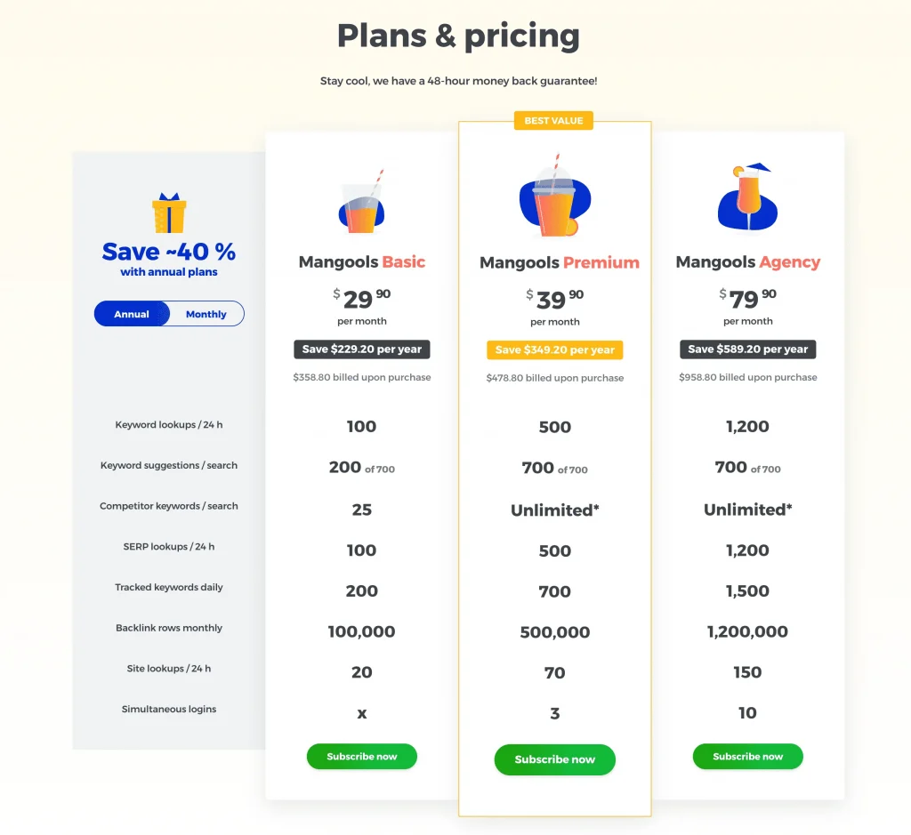 The Mangools SEO suite offers There are 3 different subscription plans to choose from. The basic plan is $29/month and includes access to the keyword research tool and the rank tracker, and the Mangools Premium plan starts at $39/month. The agency plan is $79/month and includes access to the keyword research tool, the rank tracker, and the competitor analysis tool.