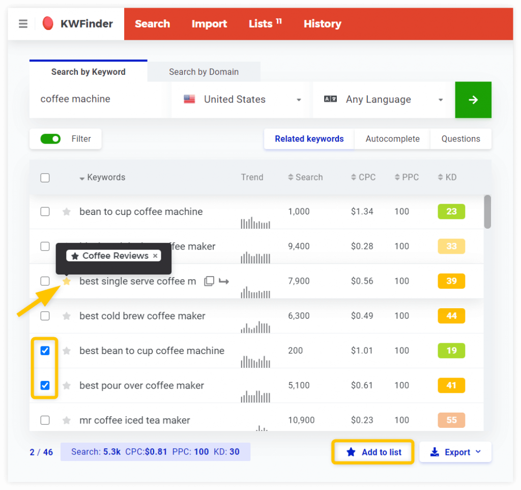 The interface of the KW Keyword research tool is really simple. Just type in the keyword and the software algorithm will display all related keywords. The user can check which are handy according to location and language, which is handy but expected as well. The KWFinder, being a professional software, is expected to present some important information like search volume, keyword difficulty, trends graph, PPC competition, CPC, etc., and here it doesn’t disappoint as all of these metrics are available.