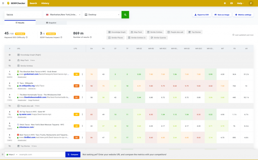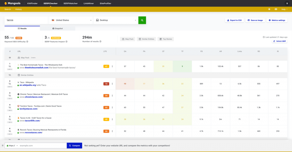 As per the information available on the Mangools’ official website, the SERPChecker analyzes Google SERPs and provides 45+ SEO metrics, including link profile strength, SEO difficulty, and Moz and Majestic metrics. Moreover, it lets SEO professionals compare their clients’ websites with the competitors’, see the strengths and weaknesses of their clients’ competitors’ websites, determine SERP positions, and detect features of Google SERPs that influence organic search results.