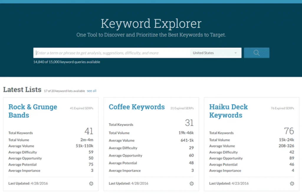 Keyword research is one of the most important parts of SEO. It’s all about balancing how often a keyword is searched and how difficult it is to rank for that keyword. Moz’s Keyword Explorer tool takes a considerable amount of SEO data and calculates metrics that have meaning for marketers. And I found it potent and dependable. I will not get into the technicalities of using the tool since it will make the post longer, and since the UX design is intuitive, most SEO experts will find out about all the methods on their own.