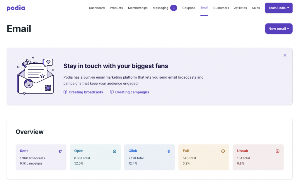 Ans: Podia allows you to host webinars, sell online courses, and ride your email marketing, all from a single dashboard.