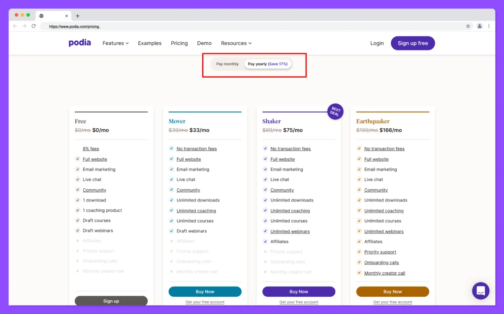 This Podia review won’t be finished without a description of pricing. Because unless you know how much Podia expenditure is, you won’t be prepared to conclude it. Podia’s pricing plans are pretty straightforward. It exhibits two plans. They are the Mover Plan which sells for $39/month and the Shaker Plan which goes for $89/month.