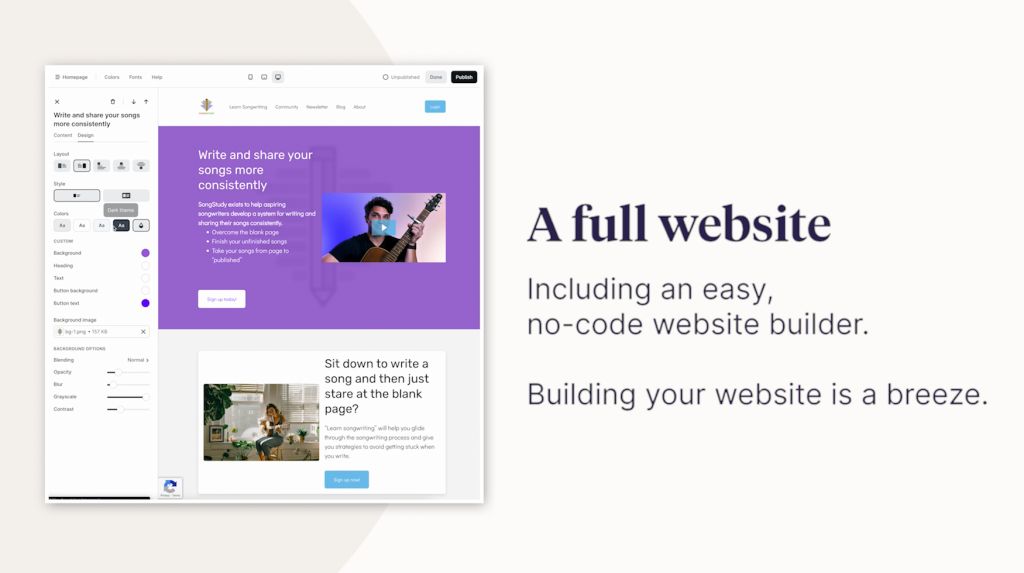 When it comes to website building, the main feature that comes to my mind is Site Themes. Now, Podia doesn’t have any location themes and there is just one template that all the shops built on the platform use by default. The only thing that you can alter at the site level is colors. You can add the main color and also colors for the background, titles, text, and buttons. Also, you can shift the default font for your body text and headings.