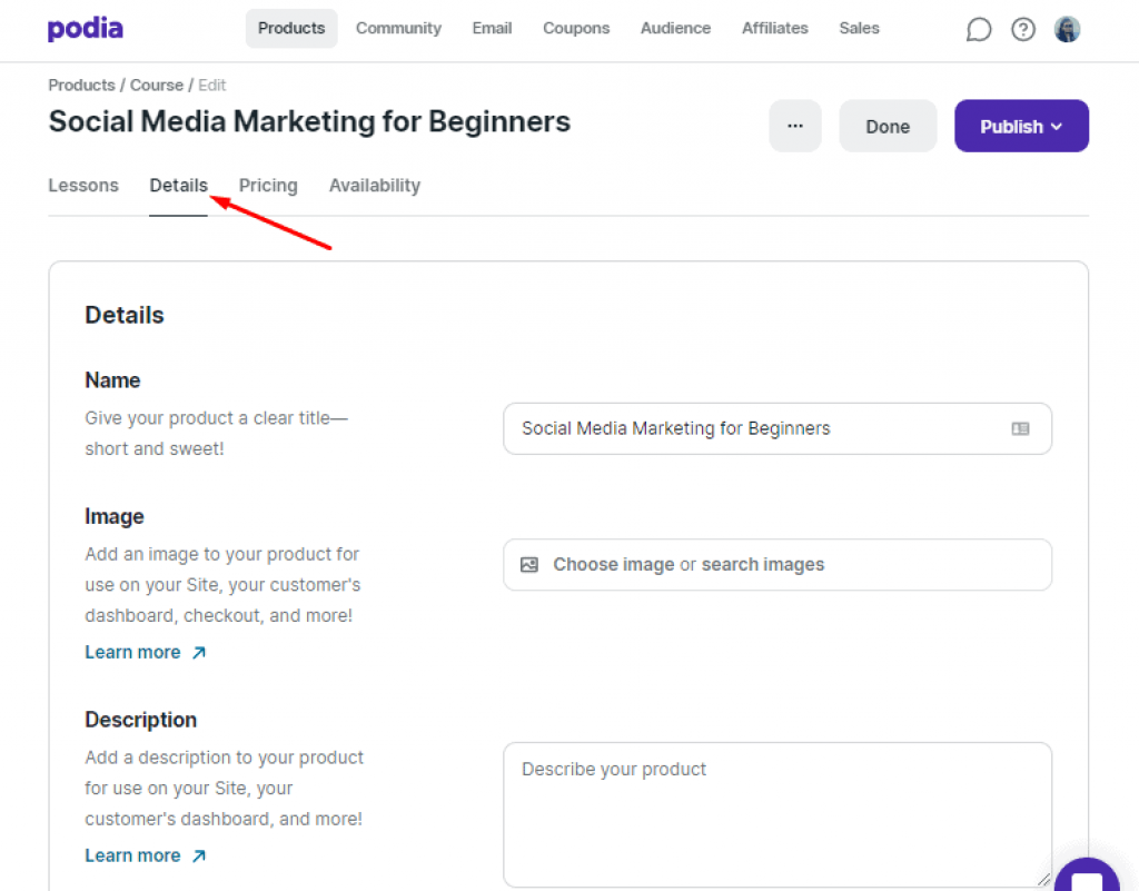 Another restriction of pricing your products in Podia is that you can select the money at a store level only and all your commodities will be priced in the same currency form.