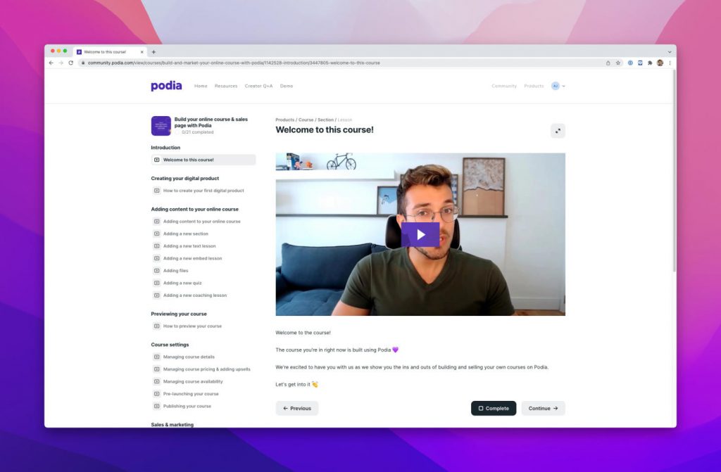 5. Course Player: The course player is where your students see your subjects and so its design impacts your students’ experience to a great extent. The good thing about Podia is that it has a course player which is very well-designed from a user experience point of view and at the same, it looks aesthetically quite impressive. Your students can see the course in the content area on the right. Then you have the “Table of Contents” in the left sidebar which your students can utilize to drive through the course.