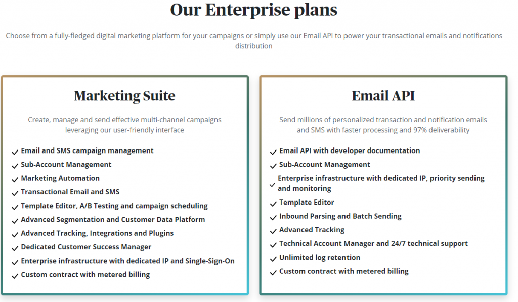 Enterprise: Starting from $1000/month, the Enterprise plan is a custom plan designed for large businesses with high-volume email-sending needs. It includes all the features of the Business plan, as well as additional features such as a dedicated account manager, custom deliverability consulting, and the ability to send up to 1 million emails per month.
