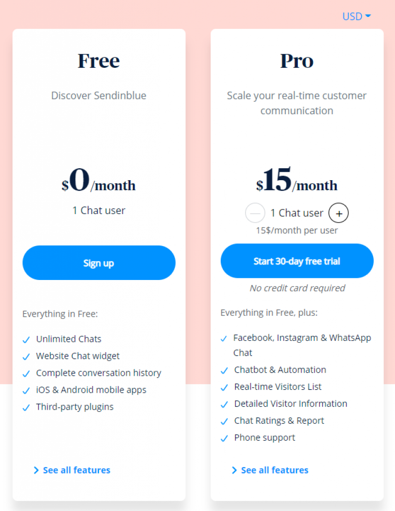Pro: The pro plan is $15 per user per month. The Pro plan gives you access to all features available for SendInBlue Chat, most notably more advanced agent productivity tools, full reporting tools, Automation workflows, Facebook and Instagram chat along with many other features.
