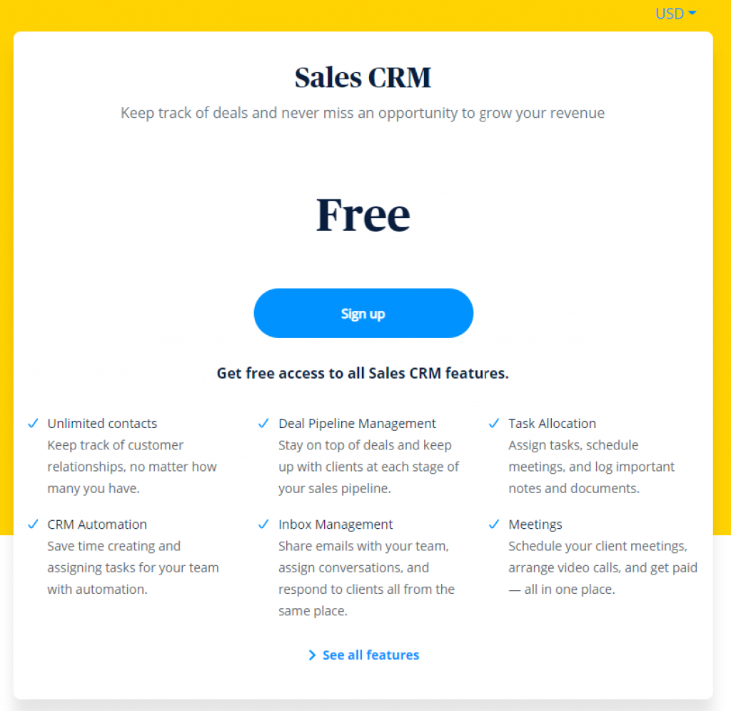The SendInBlue SalesCRM is completely free with the aim to upsell you into Chat, Transactional Emails, and the Marketing platform. The CRM has all the functionality that you would expect with a CRM such as sales pipelines, team productivity tools, SendInBlue meetings, payments, Inbox management, and automation.