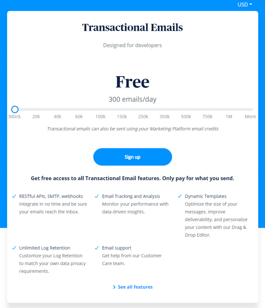 - Transactional Emails: SendInBlue offers 300 free emails per day. Transactional emails are sent in response to actions, purchases, password resets, and campaigns.