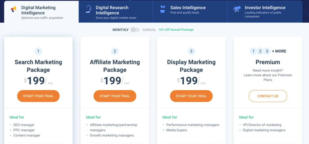 - Digital Marketing Intelligence: You can make use of this solution to find accurate data on your competitor’s website. They claim that this solution is so powerful that you can outperform the competitors in your list. It allows you to target a specific keyword, pick up the scale of your market, and maximize the landing page ROI and advertisements.