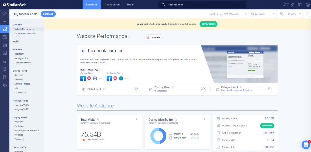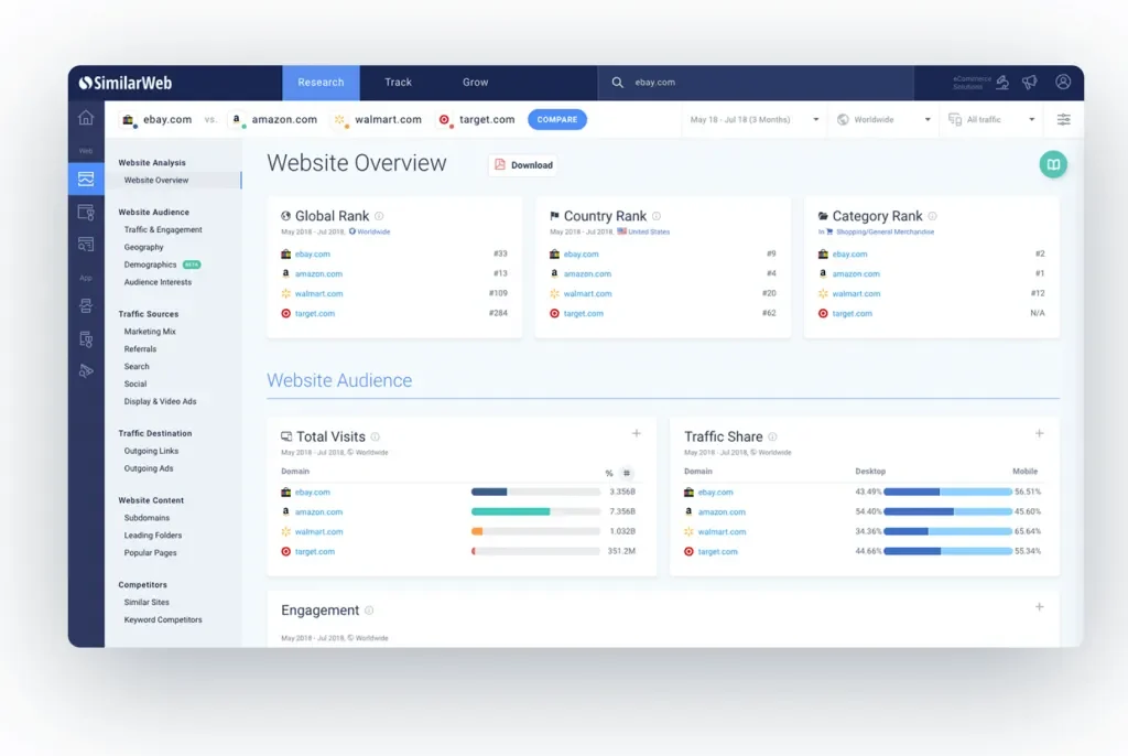 Under this tab, you can look into engagement statistics and website ranking and estimate the monthly visits of the audience. It elaborates to learn about the site’s ranking at all levels. Engagement statistics showcase the number of page views, the average visitor time on the page, and the bounce rate.