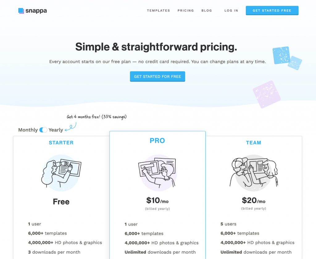Snappa offers three different pricing plans to meet the needs of individuals, businesses, and teams. These plans are the Starter plan, Pro Plan, and Team plan. Each plan offers different features and benefits, so it’s important to understand what you need before choosing a plan.