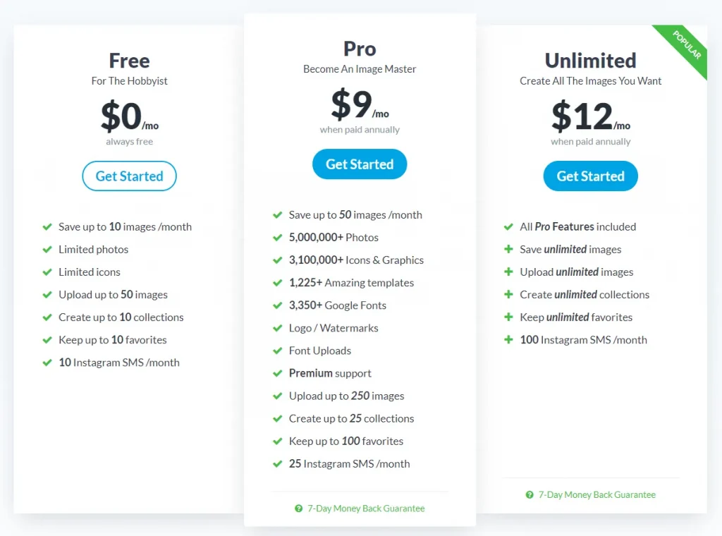 - Pro Plan: The Pro Plan is designed for individuals and small businesses who need more features and flexibility. It offers unlimited image saves per month, access to premium features such as social media graphics and premium support, and the ability to create designs up to 4MB in size. The Pro Plan costs $15 per month or $144 per year (20% discount).