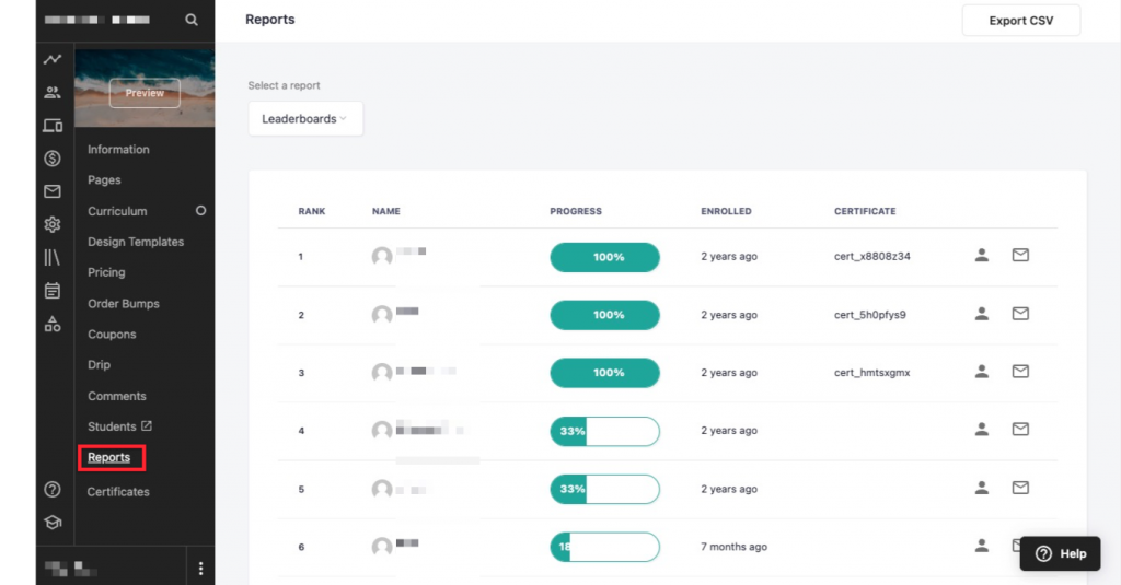 ● Leaderboards– It lets you overview which students have made the most course progress.