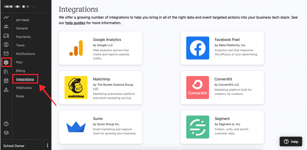 Nevertheless, from the Integrations menu, you can connect any third-party integrations that are offered to your Teachable school. The integrations menu can be accessed by: