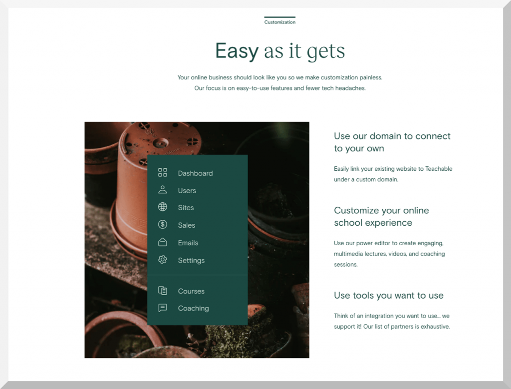 You can also edit the CSS of each theme to customize it to match your site. If you have design or programming expertise, you can also build your custom site with Teachable’s API. You can use the API to build out your entire site or integrate Teachable’s features with a site you’ve already built.