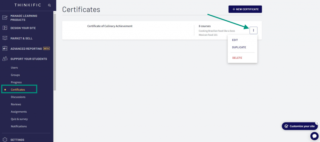 Furthermore, both you, the site owner, and the site administrators can create and assign Thinkific Certificates to one or more courses. It’s simple to use the same design for several courses because the students’ names, course names, and issue dates automatically populate based on your student and course details.