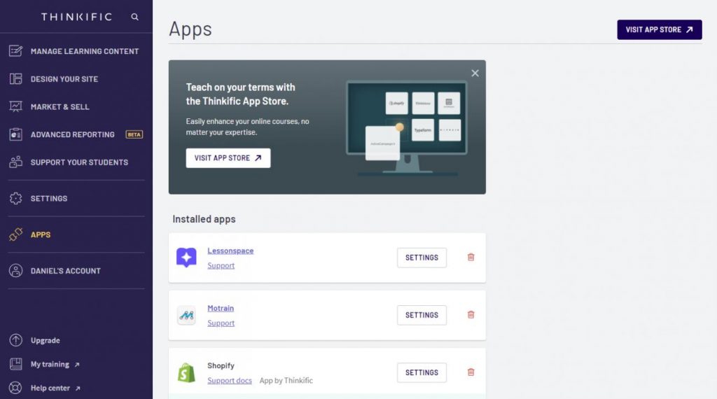 Unlike other app stores, Thinkific only offers a limited number of apps, but each one is carefully curated and reviewed to ensure it meets a high standard of quality. Each app has been tested by Thinkific, and they also provide support if you need to make changes or updates.