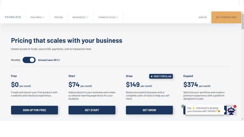 Ans: Thinkific’s most expensive plan is “Get Expand” and its pricing is $374/monthly