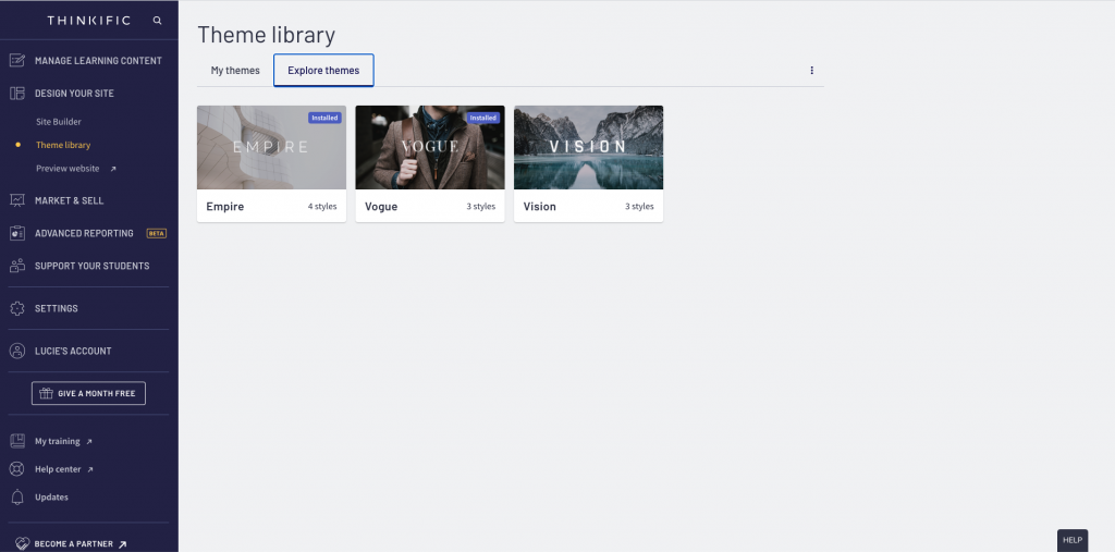 Another attractive part of my experience with Thinkific was having the ability to use the different theme designs and functionality that I could customize at no extra cost. And I don’t need to tell you that I was really happy to know that website hosting and domain registration come for free.