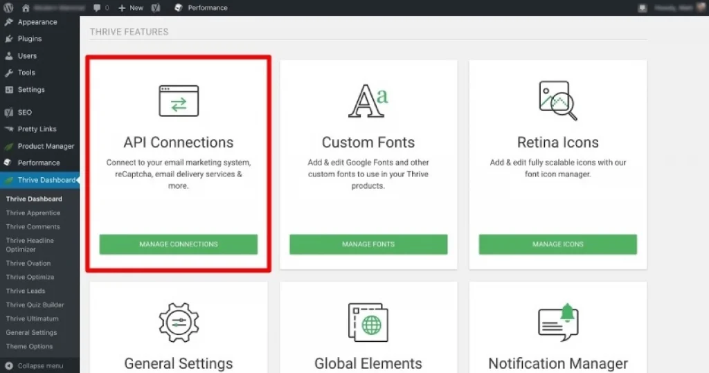 10. The next most important setup is to set API connections to integrate Thrive Themes. You can select any connections that you want to link from the main dashboard.