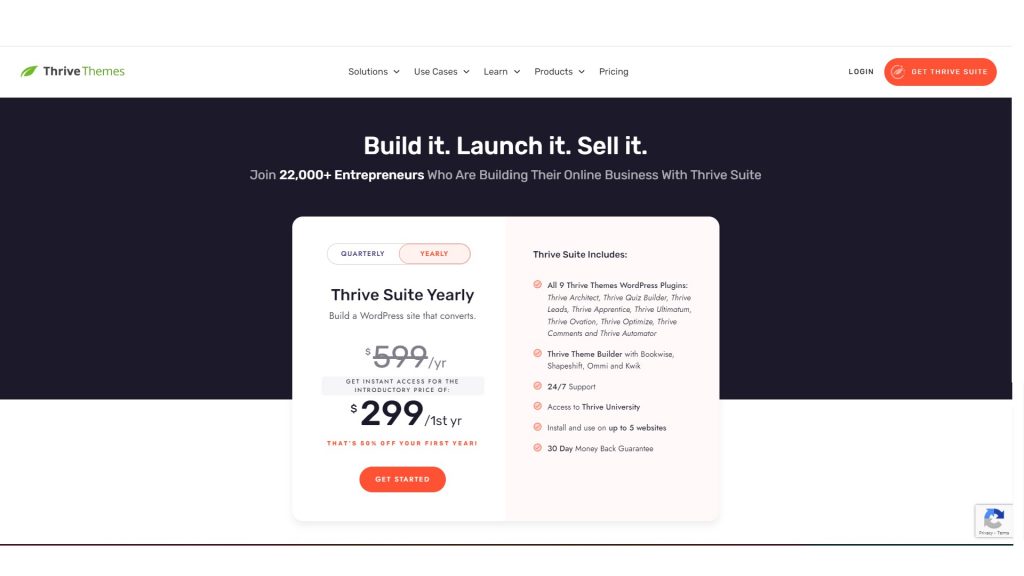 Thrive suite: The Thrive suite provides an annual price of 299$ and a quarterly price of 99$. These price plans provide features like Thrive Quiz Builder, Thrive, Theme Builder, Thrive Leads, Thrive Ultimatum, Thrive, Architect, Thrive Optimize, Thrive Ovation, Thrive Comments, Thrive Automator, and Thrive Apprentice. These allow taking back money if not satisfied within 30 days. Moreover, you can use these plans on five of your sites. There are many such takeaways in both plans. However, the Quarterly plan has one difference of not availing the lowest price to the users. Compared with the annual plan, the quarterly plan cost is higher.
