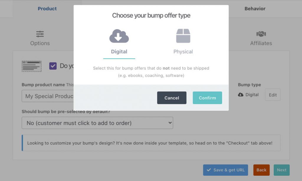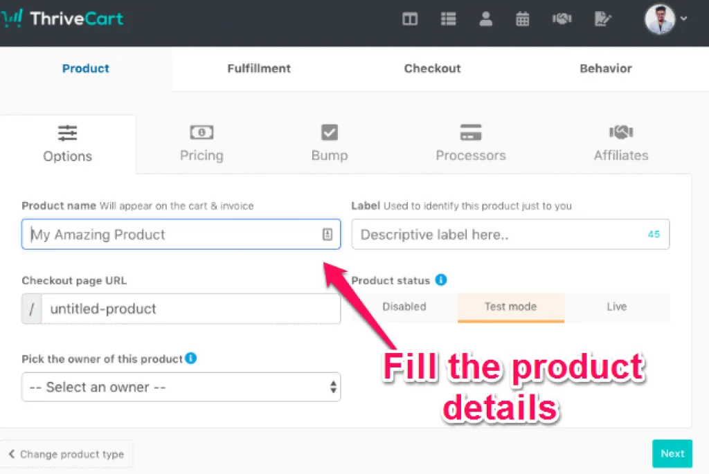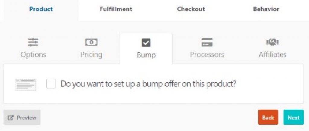 Product: This tab has further subtabs which are options, pricing, bump, processors, and affiliates.