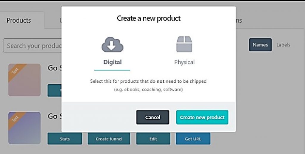 Click on the Create product option here. If you are creating a new product, then Thrivecart will give you two options one is digital, and the other is physical.