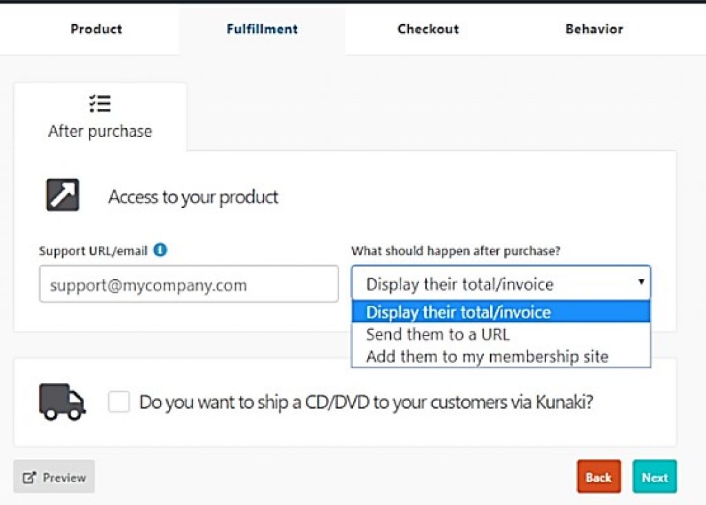 Fulfillment In this section add the URL and select from the drop out of ‘what should happen after purchase’. You can create your customer’s invoice or receipt by customizing, mailing them the URL, or adding them to the membership site.