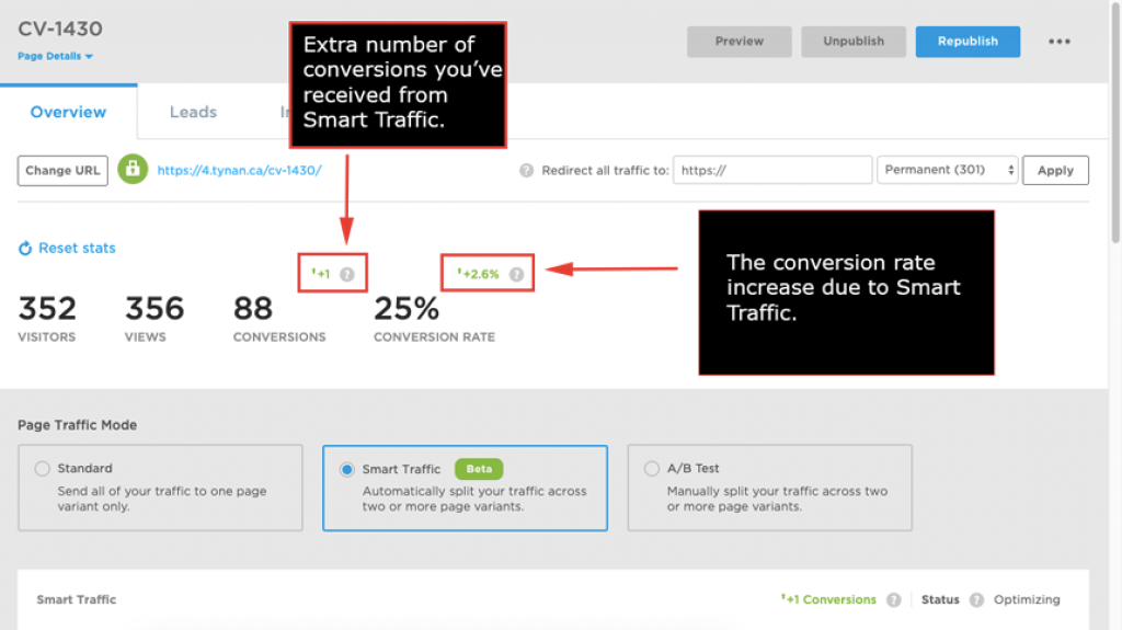 Smart traffic is an Artificial intelligence-powered tool that checks your visitor’s attributes, behavior, locations, search engines, etc., to understand the alternative they are attracted to. Therefore, providing your visitors with the best landing pages and generating more leads.
