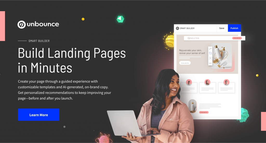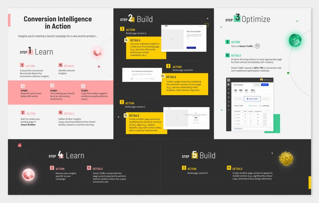 Build, Learn, and Optimize are the tools of Unbounce for accomplishing the combination of Artificial Intelligence and Marketing Intelligence.